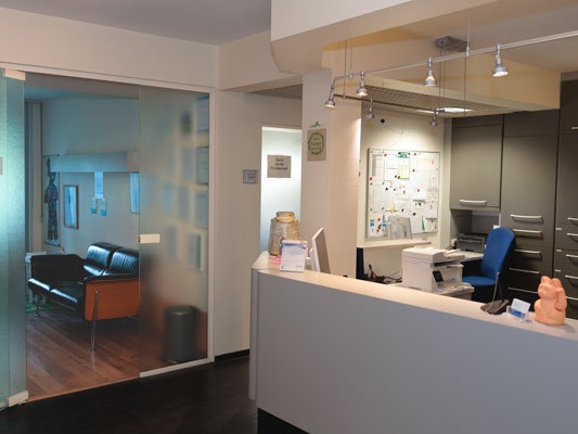 Die Praxis ist 160 qm groß, mit drei Behandlungszimmern von denen zwei Zimmer für unsere Prophylaxe bereit gestellt sind und eines für die zahnärztliche Behandlung. Ein digitaler Röntgenbereich und unser integriertes vollausgestattetes Praxislabor runden unsere Praxis ab.